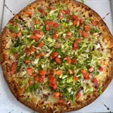 Thin crust, grilled chicken, caesar dressing, romaine lettuce and parmesan.